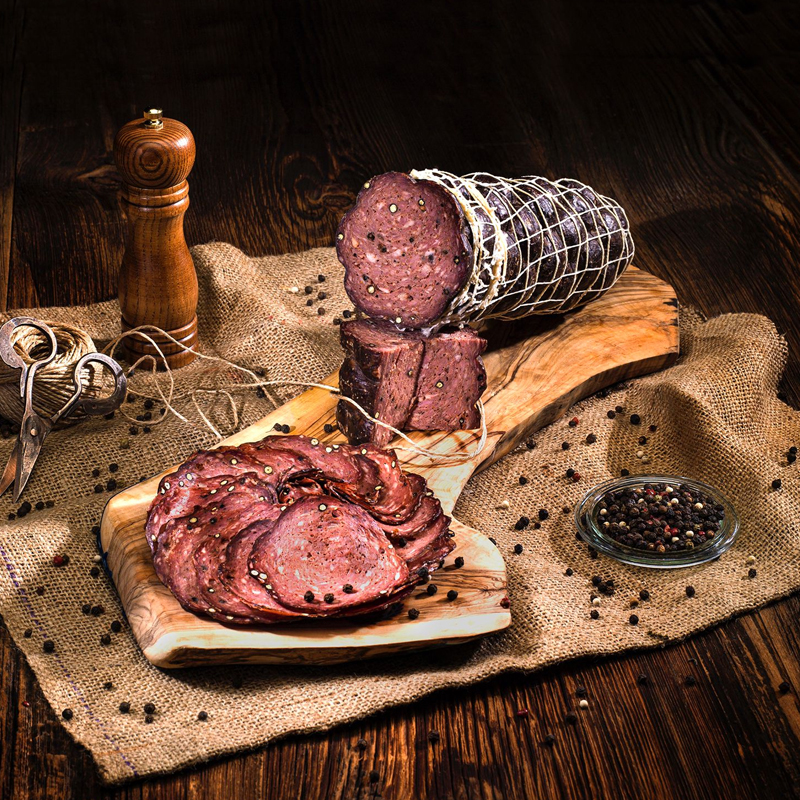 30 gün iklimlendirme odasında İtalyan usulü olgunlaştırılmış, meşe odunu ile tütsülenmiş, 8 saat kurutulmuş, karabiberli, dana salam.